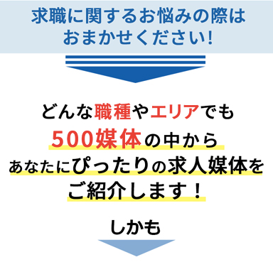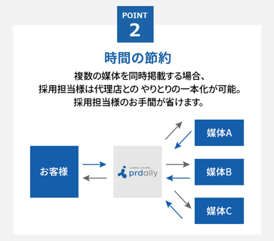 多数の媒体を取り扱っているので、媒体の特徴や情報・ノウハウが他社より豊富です。複数媒体を掲載する時でも、採用担当者は、代理店1社とのやりとりのみなので手間も削減。また複数媒体セット割引もできますので、コスト削減もできます。