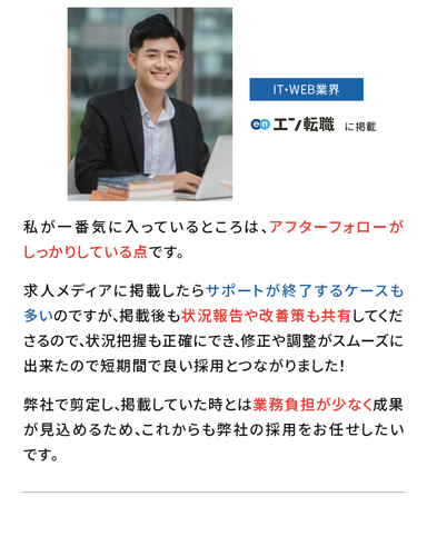 求める人物像や仕事上で必要なスキルに加え、リモート対応等の労働環境を詳細に記載することで仕事内容や企業文化をしっかり把握できていないミーハー応募によるミスマッチを軽減。応募数を増やすための原稿ではなく、応募者の質を向上させることに注力した原稿にすることでミスマッチがない採用を実現しました。